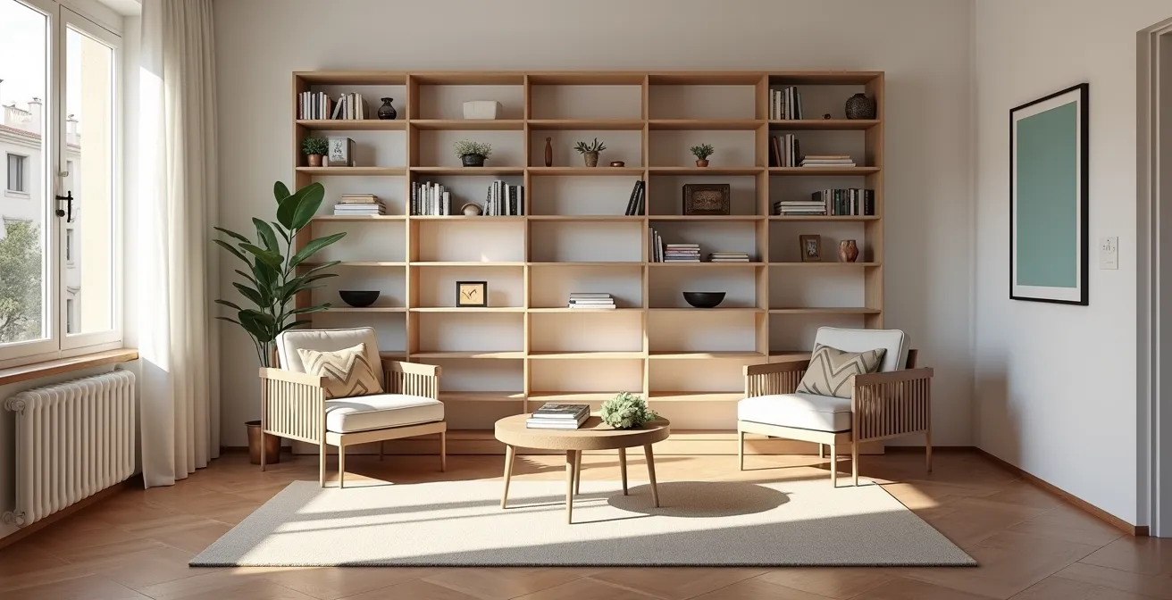 La estantería abierta, como la icónica KALLAX de IKEA, es la solución más popular por una razón: ofrece un equilibrio casi perfecto entre división física y permeabilidad visual. A diferencia de un biombo opaco, su estructura de cubos permite que la luz natural siga fluyendo entre las dos nuevas zonas, evitando la temida sensación de «cueva» en el lado más alejado de la ventana. Sin embargo, es crucial entender su principal limitación: el impacto acústico es mínimo. Su diseño abierto no bloquea las ondas sonoras, por lo que no es la opción ideal si buscas crear una oficina silenciosa junto a un salón ruidoso.