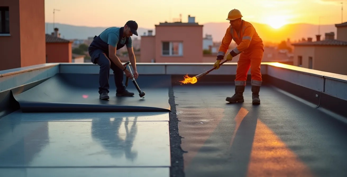 La diferencia fundamental entre una solución duradera y un problema a futuro radica en un concepto simple: las juntas. La tela asfáltica tradicional viene en rollos de un metro de ancho. Esto significa que en una terraza de 100 m², tendrá aproximadamente 100 metros lineales de juntas solapadas y soldadas con fuego. Cada centímetro de esa soldadura es un punto potencial de fallo, una oportunidad para el error humano o la degradación por los ciclos de frío y calor. Es una lotería que, tarde o temprano, suele acabar en goteras.
